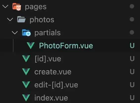 有时,你的组件可能只在单个页面或单个资源的几个页面中有用(例如上文中的 photos 资源)。在这种情况下,我发现将这些组件存储在 pages/[resource (ie. photos)] 目录下的某个目录中会很有帮助,而不是放在 components 目录中。我喜欢把这个目录称为 partials 。它在文件系统中的样子如下: