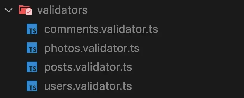 为了在我的项目中组织这些资源,我喜欢创建一个 @/validators 目录,然后为每种不同的资源类型创建一个文件。像这样: